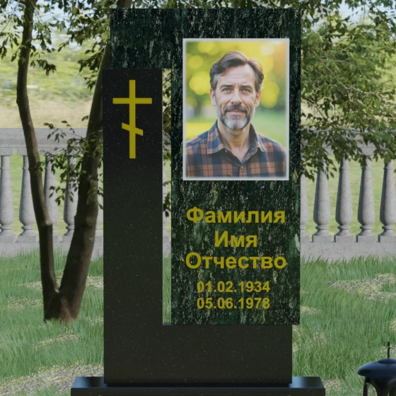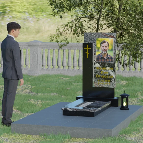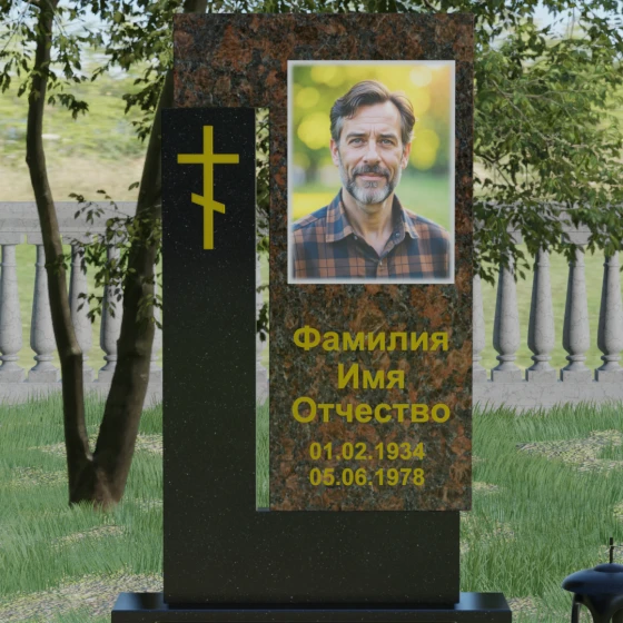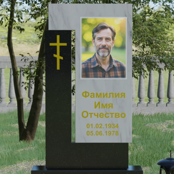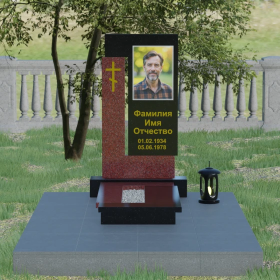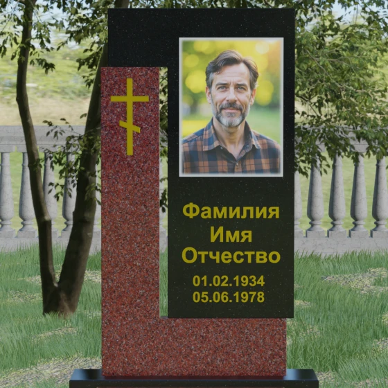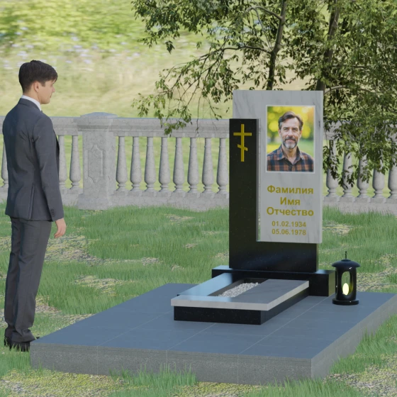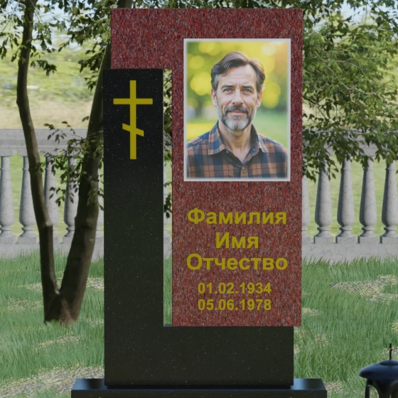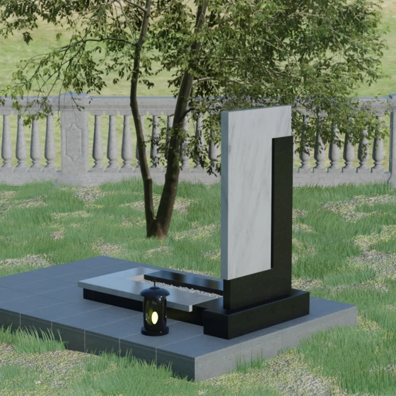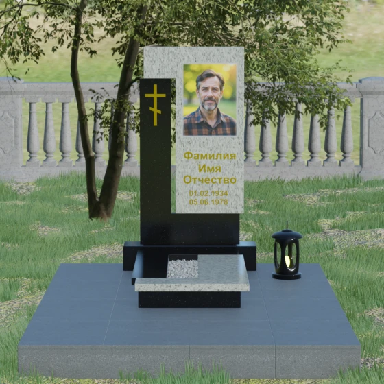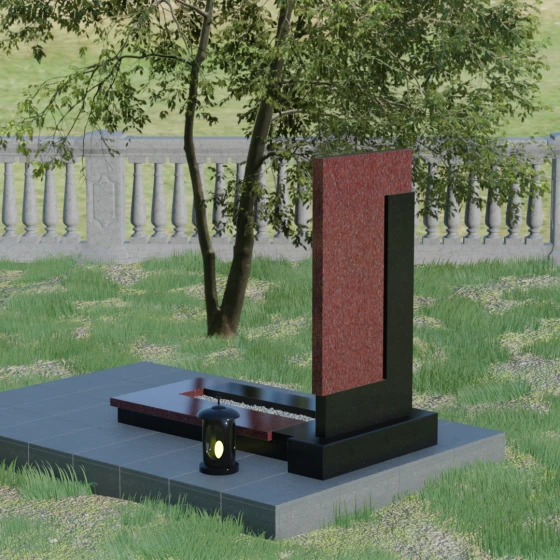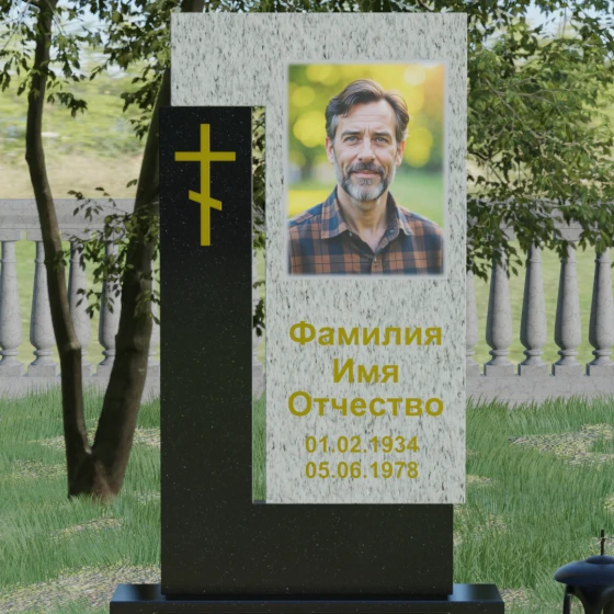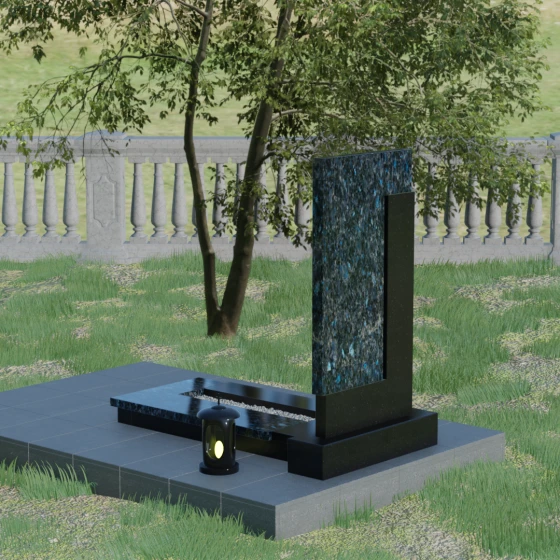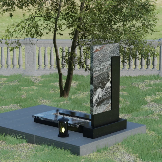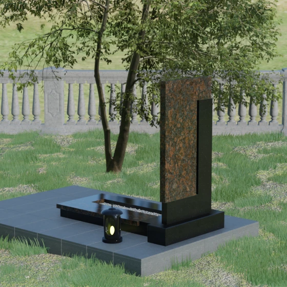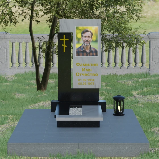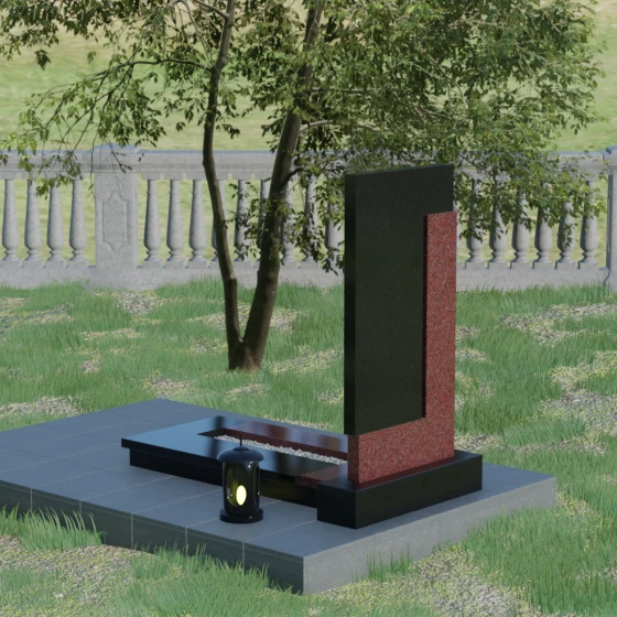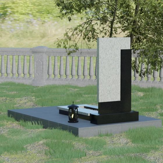 Данная модель выделяется своей сложной, архитектурно выверенной асимметрией. Основная вертикальная стела, выполненная из глубокого черного камня, дополнена массивным Г-образным элементом, который словно обнимает центральную часть, создавая защитный контур. Геометрия изделия строгая и лаконичная: прямые углы и четкие фаски подчеркивают монументальность конструкции. Особое внимание уделено игре фактур: идеально гладкая, зеркальная полировка лицевых граней контрастирует с архитектурной сложностью сочленения двух блоков.