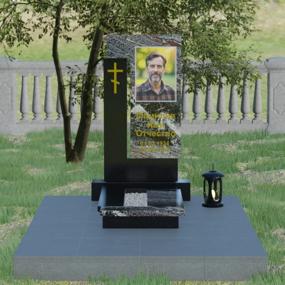 На боковом пилоне расположен каноничный православный крест. Его исполнение отличается благородной простотой — это лаконичный трехсоставный символ веры, который не перегружает композицию, но расставляет необходимые духовные акценты. Благоустройство участка продумано до мелочей: стела установлена на широкий полированный цоколь, а место захоронения полностью закрыто сплошной надгробной плитой. Такое решение не только придает ансамблю вид законченного монолита, но и обеспечивает практичность, избавляя от необходимости сложного ухода за почвой.