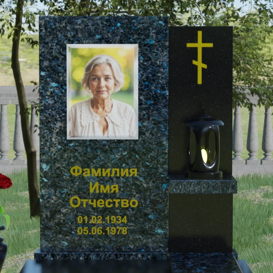 Кому подойдет: Данная модель является универсальной благодаря своему лаконичному и одновременно глубокому дизайну. Она станет достойным выбором как для мужчины, так и для женщины. Строгость линий и золотые акценты подчеркнут статус и мужество, а плавные изгибы верхней грани привнесут нотки женственности и нежности. Этот мемориал выбирают те, кто хочет выразить глубокое уважение и создать на кладбище место, преисполненное достоинства и тишины, где каждый элемент — от лампады до фактуры камня — говорит о вечной любви.