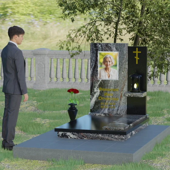 Представленная модель отличается изысканной асимметрией и сложной геометрией, где две вертикальные стелы разной высоты сливаются в единый гармоничный ансамбль. Левая часть, более высокая и массивная, имеет плавный дугообразный срез в верхней части. Этот мягкий изгиб символизирует бесконечность жизненного пути и обретенный вечный покой, смягчая строгость натурального камня. На этой панели располагается портрет и основная информация, выполненная глубокой гравировкой с золочением. Правая часть композиции, выполненная из контрастного камня, служит духовным акцентом: на ней закреплен лаконичный православный крест, сияющий золотом, что подчеркивает веру и надежду на вечную жизнь.