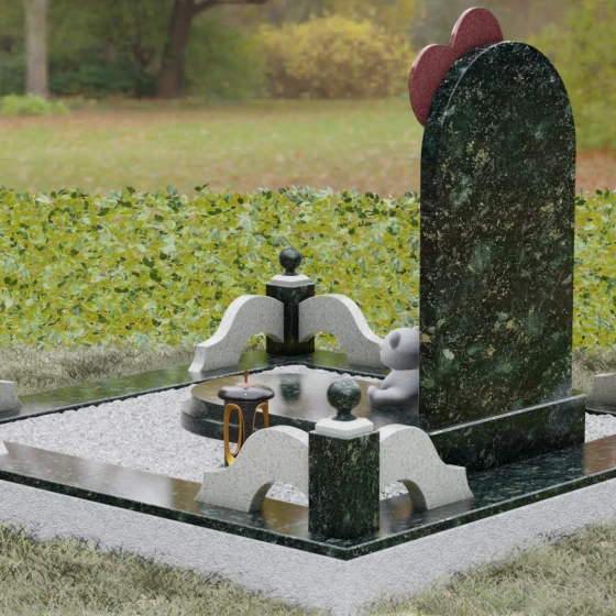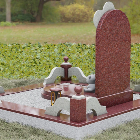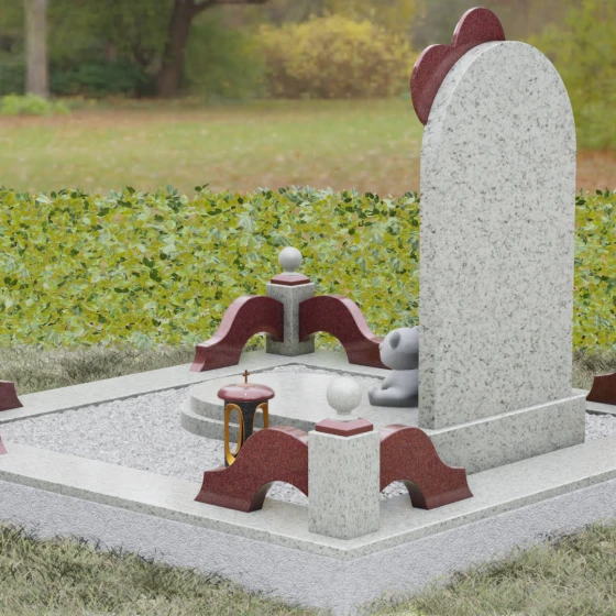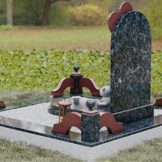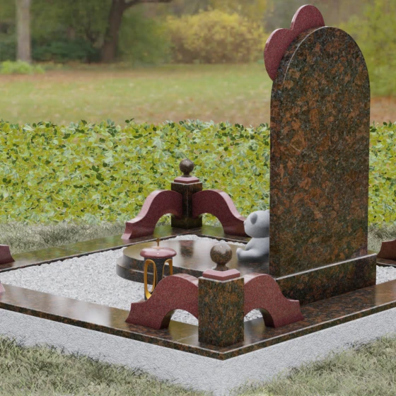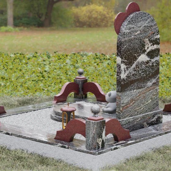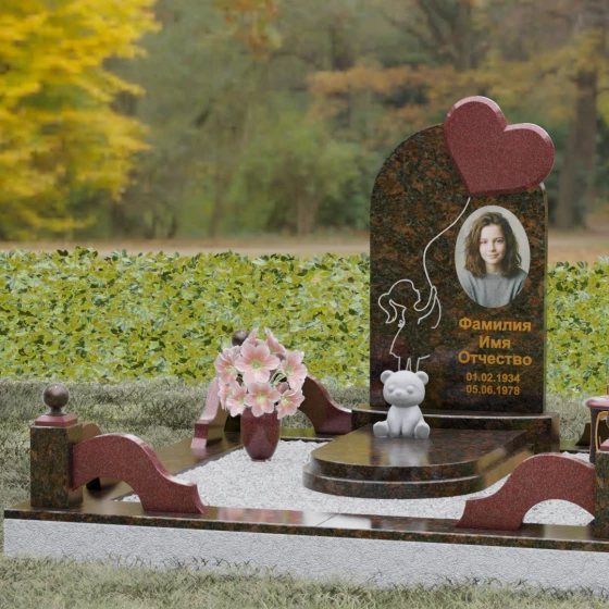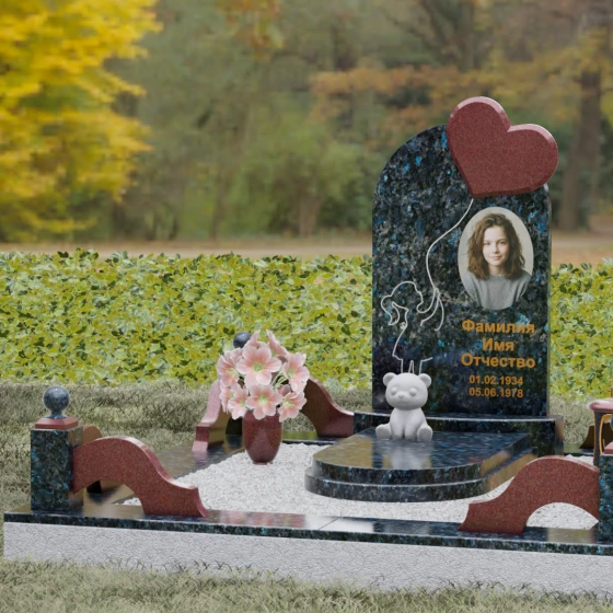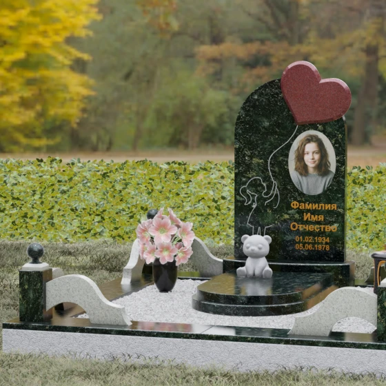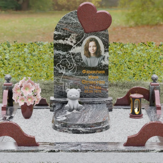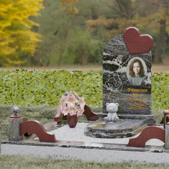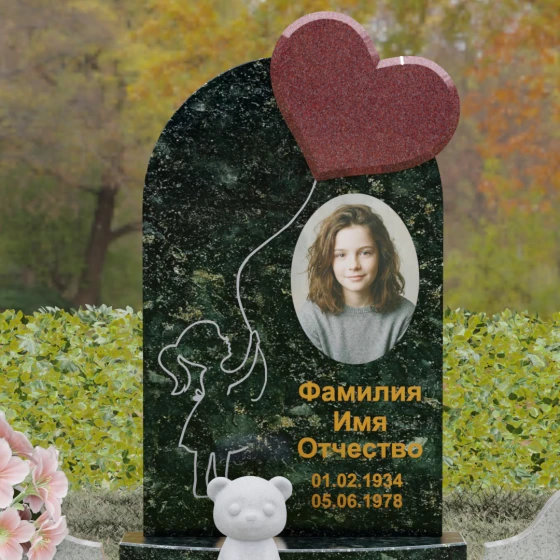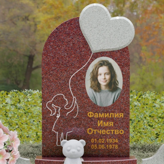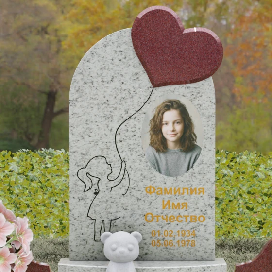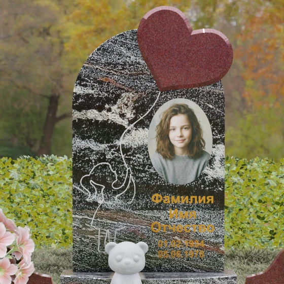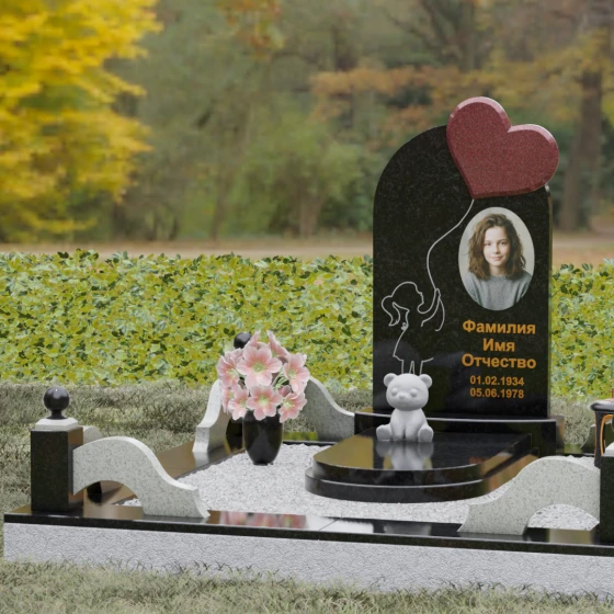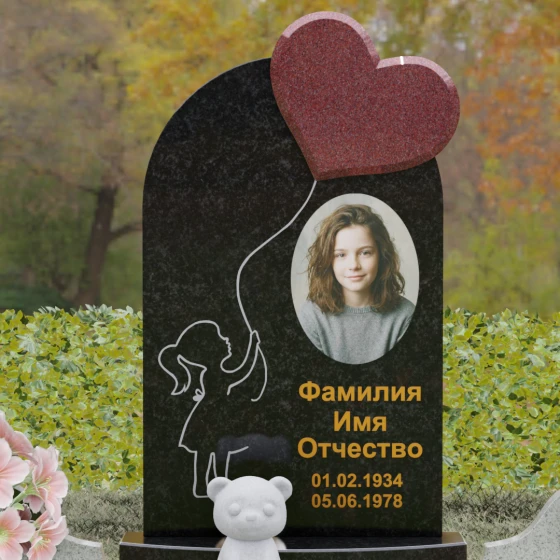 Представленная мемориальная композиция — это не просто надгробие, а глубокое художественное высказывание, в котором застыло мгновение нежности и вечной связи. Основная стела выполнена в форме изящной асимметричной арки из глубокого черного гранита. Главным акцентом ансамбля выступает объемное сердце из насыщенного красного камня, которое словно парит в воздухе, подобно легкому воздушному шару. Тонкая, едва уловимая линия резьбы соединяет этот символ любви с рукой выгравированного силуэта маленькой девочки. Мастерски исполненная гравировка ребенка с хвостиком, тянущегося вверх, придает всей конструкции невероятную легкость и трогательность. Игра контрастов здесь возведена в абсолют: зеркальная полировка черного обелиска соседствует с ярким цветом сердца, создавая эффект трехмерного пространства и визуального объема.