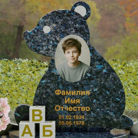 Центральным элементом ансамбля является стела, выполненная в уникальной форме силуэта плюшевого мишки. Это решение выбрано не случайно: мягкие, округлые контуры ушей и головы создают ощущение защищенности и бесконечной любви. Мастера-камнерезы добились идеальной плавности переходов, превратив массивную плиту в трогательную скульптуру. В центре силуэта расположена овальная вставка для портрета, которая визуально акцентирует внимание на образе ушедшего, делая его смысловым сердцем всей композиции. Нижняя часть стелы дополнена объемными декоративными элементами в виде детских кубиков с буквами «А», «Б» и «В». Эти малые архитектурные формы вырезаны из камня с высокой точностью, подчеркивая тематику вечного детства.