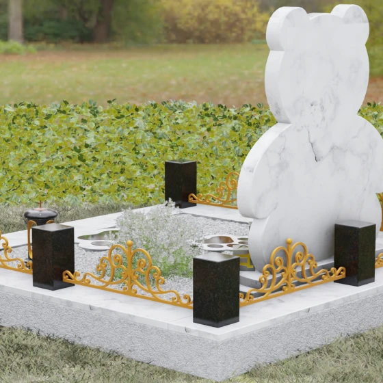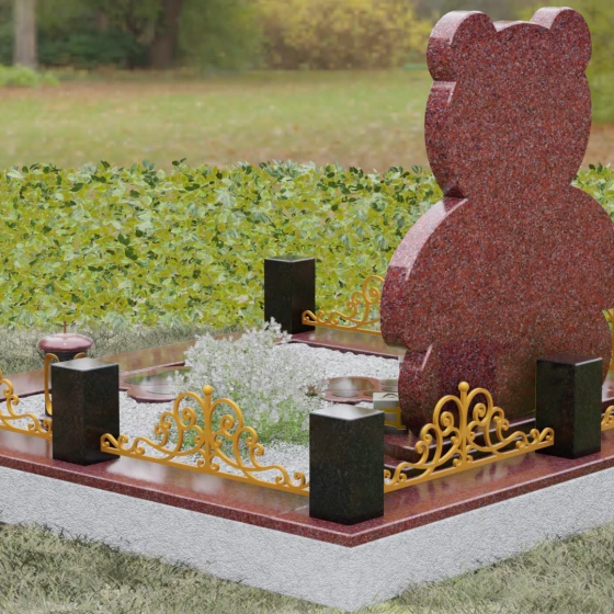 Представленное надгробие из натурального камня (Артикул 235) — это подлинное произведение мемориального искусства, в котором монументальность гранита встречается с трогательной нежностью художественного образа. Силуэт памятника выполнен в форме стилизованной фигуры медвежонка, что мгновенно переводит восприятие из плоскости строгой скорби в область светлых, чистых воспоминаний о невинности и искренности. С точки зрения искусствоведа, выбор такой формы является глубокой аллегорией вечной защиты и неувядающей любви: округлые, мягкие линии стелы лишены острых углов, что символизирует бесконечность и гармонию.