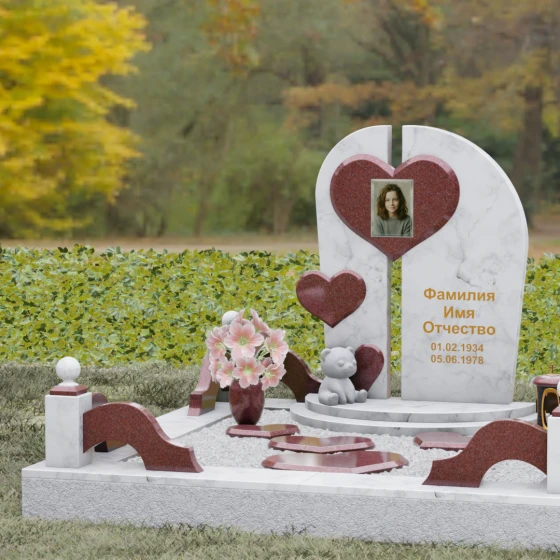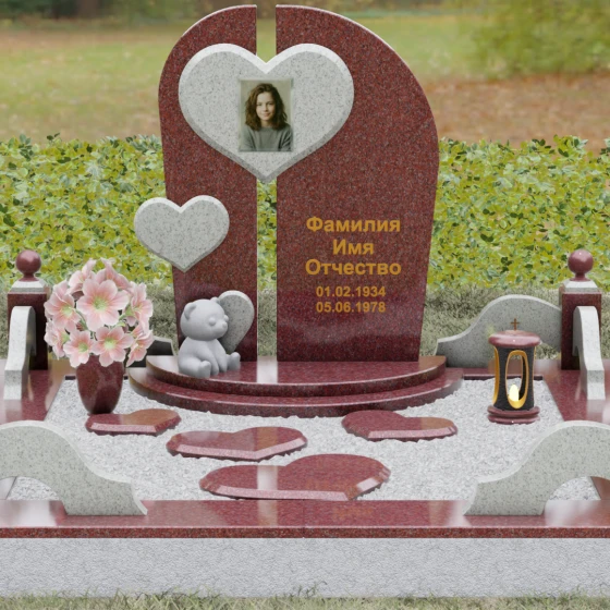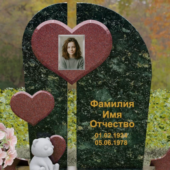 Каждая линия этой модели наполнена глубоким смыслом. Разделенная на две части стела символизирует границу между двумя мирами, а объединяющее их сердце — торжество любви над временем и забвением. Фигура медвежонка у подножия — символ чистоты, беззащитности и невинной души, что часто выбирают для оформления захоронений самых дорогих и рано ушедших близких. Использование контрастных цветов камня подчеркивает многогранность человеческой жизни, где есть место и глубокой скорби, и светлым воспоминаниям. Этот памятник не просто обозначает место покоя, он рассказывает историю глубокой привязанности, которая не исчезает с годами.