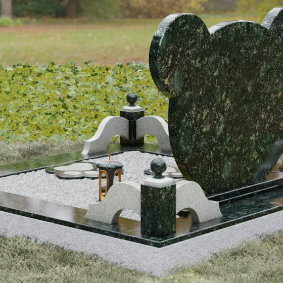 Завершают облик ансамбля функциональные и декоративные элементы: изящная гранитная ваза с плавными изгибами и закрытая каменная лампада, внутри которой мягко мерцает свет. Каждый элемент этой мемориальной композиции, от филигранно выточенных «ушек» до зеркально отполированной надгробной плиты, свидетельствует о глубоком уважении к памяти ушедшего. Это исполненное любви и профессионализма воплощение вечности в камне, которое станет достойным символом памяти, согревающим сердце своей теплотой и совершенством форм.
