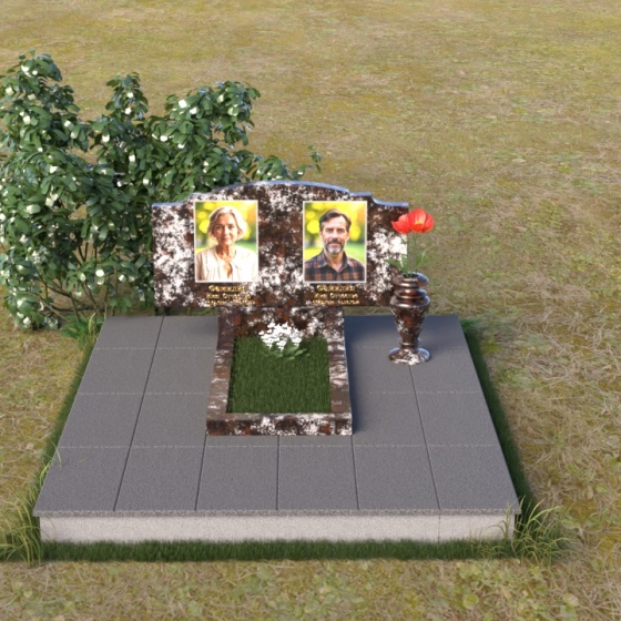 Этот гранитный монумент представляет собой композицию, где каждая деталь продумана до мелочей. Верхняя часть памятника имеет фигурную форму с плавными, волнообразными очертаниями, словно застывшая мелодия скорби. Верхний край обработан таким образом, что создает впечатление легкой, воздушной драпировки. Боковые грани аккуратно скруглены, смягчая строгость камня и придавая ему более изящный вид. Фаски, снятые по периметру, подчеркивают контур и добавляют выразительности. Лицевая поверхность отполирована до зеркального блеска, отражая свет и создавая ощущение глубины. На полированной поверхности выгравированы портреты усопших и памятные надписи, выполненные с особой тщательностью и вниманием к деталям. Под основной плитой располагается горизонтальная плита, также выполненная из черного гранита, создающая дополнительный уровень и подчеркивающая монументальность композиции. На ней размещена еще одна полированная плита, но уже меньшего размера, как символ нерушимости и продолжения рода.