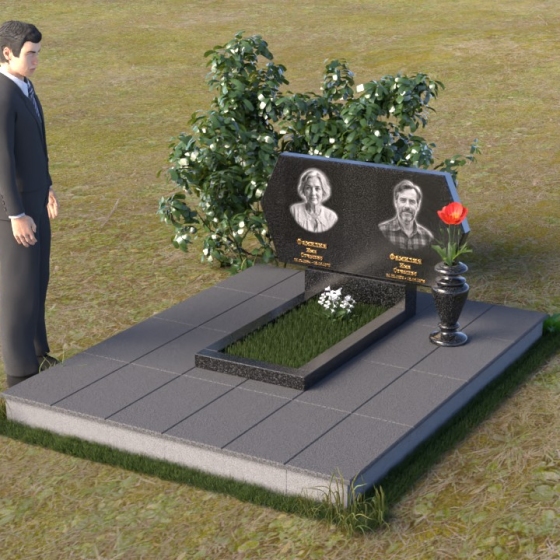 Величественная стела памятника ПГ004 представляет собой элегантное сочетание строгих линий и мягких, сглаженных углов. Верхняя часть имеет форму, близкую к прямоугольнику, но с деликатно скошенными верхними углами, что придает ей визуальную легкость и утонченность. Боковые грани плавно переходят в лицевую поверхность, создавая ощущение обтекаемости и завершенности. Фаска по периметру лицевой стороны подчеркивает четкость контура и добавляет дополнительный объем. Нижняя часть стелы, служащая основанием для размещения информации и портретов, выполнена в форме прямоугольной призмы, гармонично сочетающейся с основной частью памятника. Подставка под вазу выполнена в классическом стиле и имеет плавные обтекаемые формы.