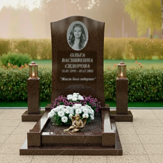 Особое внимание уделено благоустройству участка. Монумент установлен на прочный, низкий гранитный цоколь, который четко очерчивает границы мемориала, придавая ему завершенный и монументальный вид. Надгробная плита, выполненная из того же глубокого черного гранита, что и стела, создает единое, безупречное покрытие, которое не только эстетично, но и значительно упрощает уход за местом упокоения. По углам комплекса расположены два массивных каменных столбика из светлого гранита с выразительной фактурой, на которых установлены изящные бронзовые лампады. Эти лампады с их теплыми оттенками металла и стекла добавляют комплексу элементы торжественности и вечного света. В центре надгробной плиты находится небольшая, аккуратно оформленная клумба, где пышные белые и фиолетовые цветы создают живой акцент, символизирующий продолжение жизни и красоту. Рядом с цветами расположена небольшая фигурка спящего ангела, выполненная из бронзы, что добавляет композиции трогательности и символизма, напоминая о чистоте и невинности души.