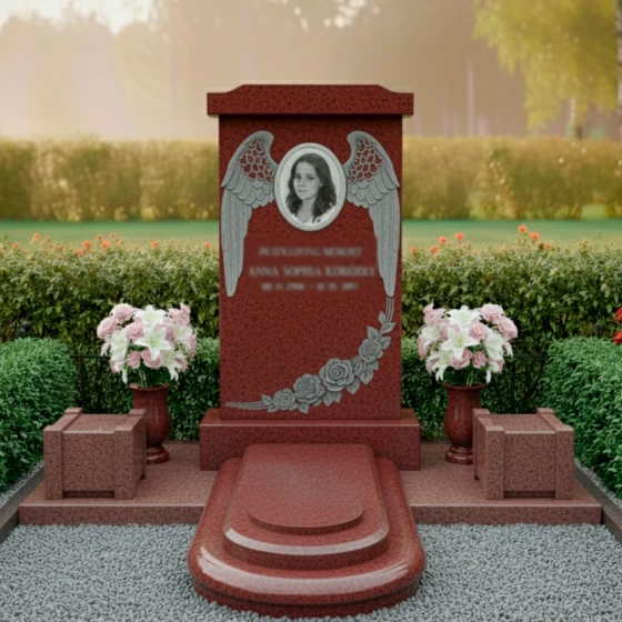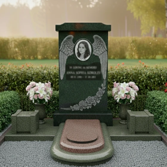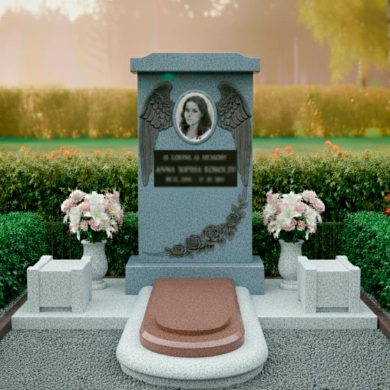 Оформление: Форма стелы ПН 135 с ее четкими линиями и плавными изгибами идеально подходит для различных видов гравировки. Овальный медальон для портрета, обрамленный крыльями ангела, создает идеальное пространство для размещения изображения усопшего, которое будет выглядеть гармонично и достойно. Пространство под портретом и цветами позволяет элегантно расположить гравировку с полным именем, датами жизни и эпитафией. Рекомендуется использовать классические шрифты, которые подчеркнут торжественность и значимость момента, а также рассмотреть возможность добавления золочения или серебрения букв для придания дополнительной выразительности и долговечности надписям. Глубокая гравировка на полированной поверхности гранита будет смотреться особенно эффектно, обеспечивая четкость и читаемость на долгие годы.