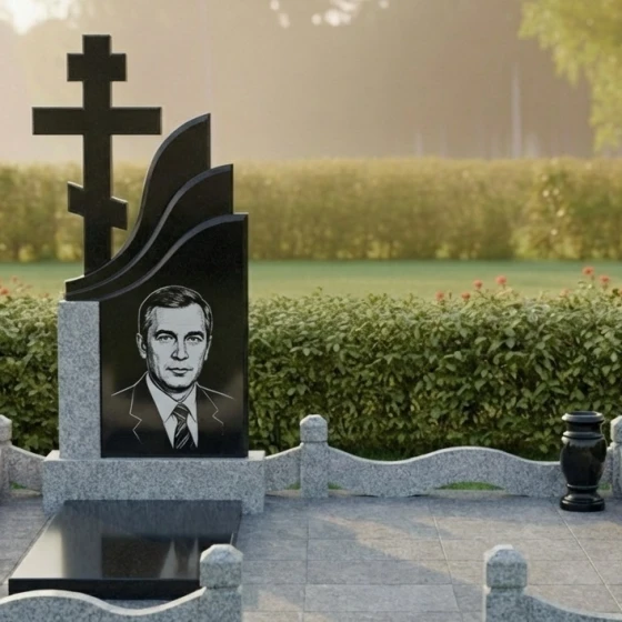 Особое внимание привлекает мастерски вырезанный православный крест, возвышающийся над стелой. Его лаконичный, но выразительный силуэт не содержит распятия, что придает ему универсальность и символизирует чистоту веры. Крест не просто установлен, а органично интегрирован в общую композицию, словно вырастая из камня, что усиливает ощущение его незыблемости. Детали резьбы выполнены с исключительной точностью: каждый изгиб, каждая линия креста несет в себе глубокий смысл, говоря о духовности и бесконечности. Зеркальная полировка черного гранита стелы, на которой ярко выделяется светлый, матовый срез камня креста, создает эффект возвышенности и благоговения. Гравировка портрета, выполненная с высокой детализацией, располагается в центральной части стелы, притягивая взгляд и сохраняя живой образ усопшего.