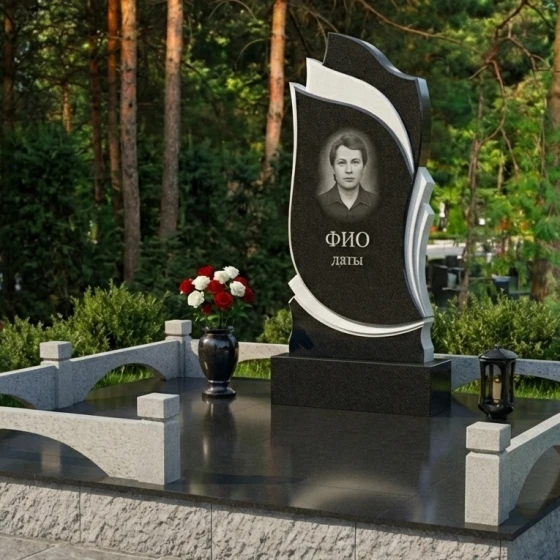 Эта мемориальная композиция, артикул ПН 448, представляет собой истинное произведение камнерезного искусства, где каждая линия и изгиб тщательно продуманы, чтобы передать глубочайшее уважение и светлую память. Взгляните на стелу: ее форма не просто прямоугольник, а динамичная, устремленная вверх волна, словно развевающееся знамя или страницы открытой книги. Центральная часть, выполненная из безупречно отполированного черного гранита, притягивает взгляд своей зеркальной поверхностью. Она контрастирует с боковыми элементами, которые, кажется, обнимают основную плиту, создавая ощущение защиты и уюта. Эти боковые грани имеют более светлый, матовый оттенок, что подчеркивает объем и глубину композиции, придавая ей легкость и воздушность, несмотря на массивность камня.