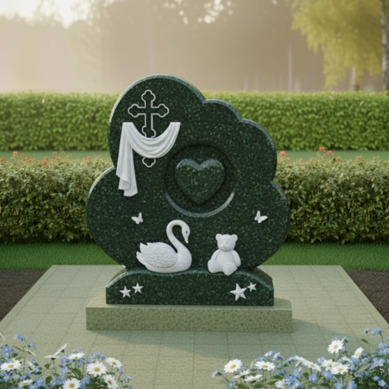 Форма этого мемориального комплекса глубоко символична. Плавные линии и мягкие очертания стелы олицетворяют покой и умиротворение, напоминая о тихой гавани, где душа находит вечный приют. Драпировка вокруг креста говорит о скорби, но одновременно и о защите, которую дарует вера. Сердце в центре – это не просто символ любви, а средоточие всех чувств, которые связывают нас с ушедшим. Лебедь и мишка, окруженные бабочками и звездами, создают образ невинности, чистоты и вечной нежности, напоминая о хрупкости жизни и красоте души. Этот памятник – это не прощание, а обещание помнить, любить и хранить светлый образ ушедшего человека в своем сердце навсегда.