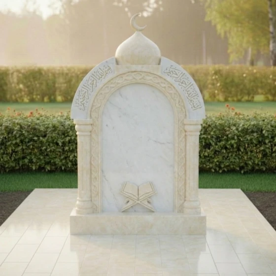 Представляем вашему вниманию величественное надгробие из натурального камня, модель ПН 507, которое является воплощением глубокого уважения и вечной памяти. Этот мемориальный комплекс спроектирован с учетом строгих архитектурных принципов, где каждая линия и форма призваны выразить достоинство и умиротворение. Центральная стела выполнена в форме изящной арки, напоминающей вход в священное пространство, что придает ей особую символичность. Ее внутренняя часть представляет собой глубокий черный полированный портал, создающий эффект зеркальной глади, в которой отражается свет и скорбь. Внешний периметр арки украшен тонкой резьбой, имитирующей витиеватые узоры, характерные для восточной архитектуры, что придает монументу уникальный и узнаваемый облик. Над аркой возвышается куполообразный элемент, увенчанный полумесяцем, что недвусмысленно указывает на его религиозную принадлежность и придает всей композиции завершенность и духовную значимость. Полумесяц выполнен с деликатной точностью, его острые грани четко очерчены на фоне неба, символизируя светлую память.