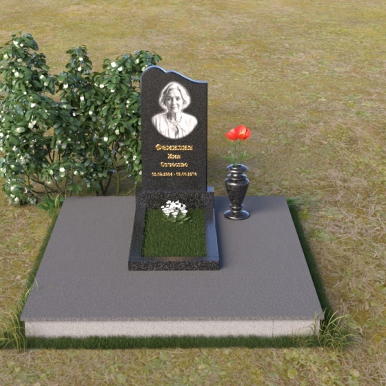Памятник ПВ 017 – это воплощение сдержанной элегантности и глубокого уважения. Величественная стела, выполненная в форме плавной арки, словно устремляется в небеса, символизируя духовное возвышение. Верхняя часть стелы деликатно скруглена, смягчая строгие линии камня и придавая облику памятника теплоту и человечность. Полированная до зеркального блеска поверхность черного гранита контрастирует с матовым изображением лица и надписями, создавая завораживающий эффект глубины и объема. Этот контраст акцентирует внимание на личности ушедшего, его жизненном пути и неповторимом образе.