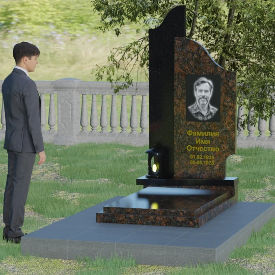 Данная мемориальная композиция представляет собой сложный архитектурный ансамбль, в основе которого лежит игра геометрических форм и контрастных фактур. Основная стела состоит из двух вертикальных элементов разной высоты и конфигурации, что создает динамичный и в то же время уравновешенный силуэт. Левая часть стелы выполнена с мягким, волнообразным изгибом, напоминающим спокойное течение времени или уходящий за горизонт путь. Правая часть — более высокая, узкая и статная, с асимметричным «рваным» навершием, которое символизирует возвышенность духа и незыблемость памяти. Такое сочетание плавности и резкости делает это надгробие из натурального камня универсальным решением, способным передать как нежность утраты, так и твердость характера ушедшего человека.