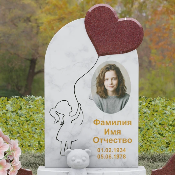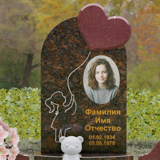 Представленная мемориальная композиция — это не просто надгробие, а глубокое художественное высказывание, в котором застыло мгновение нежности и вечной связи. Основная стела выполнена в форме изящной асимметричной арки из глубокого черного гранита. Главным акцентом ансамбля выступает объемное сердце из насыщенного красного камня, которое словно парит в воздухе, подобно легкому воздушному шару. Тонкая, едва уловимая линия резьбы соединяет этот символ любви с рукой выгравированного силуэта маленькой девочки. Мастерски исполненная гравировка ребенка с хвостиком, тянущегося вверх, придает всей конструкции невероятную легкость и трогательность. Игра контрастов здесь возведена в абсолют: зеркальная полировка черного обелиска соседствует с ярким цветом сердца, создавая эффект трехмерного пространства и визуального объема.