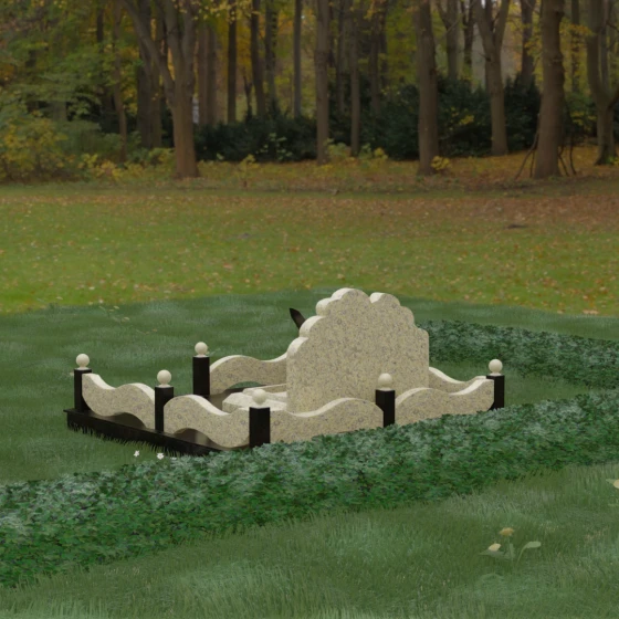 Особое внимание уделено благоустройству участка. Вместо традиционного открытого грунта здесь реализовано полное мощение массивными гранитными плитами. Такое решение не только придает захоронению завершенный и дорогой вид, но и значительно упрощает уход за местом памяти, сохраняя безупречную чистоту в любое время года. Окружающий монумент цоколь выполнен в виде изящных волнообразных панелей, соединенных столбиками с навершиями в форме идеальных каменных шаров. Эти сферы добавляют композиции торжественности и завершенности, подчеркивая элитный статус мемориала.