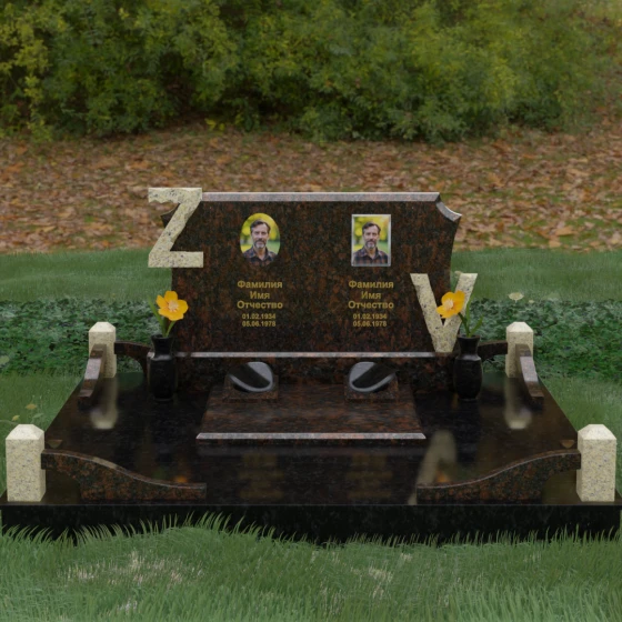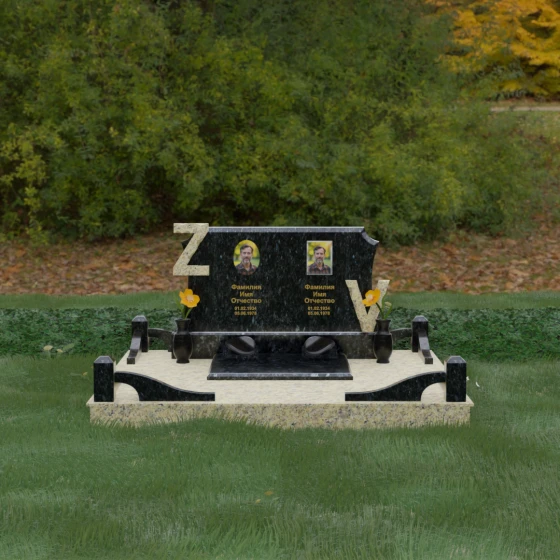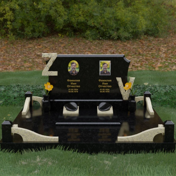 Центральным элементом изделия является массивная горизонтальная стела, обладающая сложной многоуровневой геометрией. Верхняя грань плиты украшена изящными симметричными вырезами, которые смягчают строгость прямоугольных форм и придают конструкции завершенный, эстетически выверенный вид. Особое внимание привлекает игра контрастов: глубокая зеркальная полировка основного массива камня эффектно подчеркивается светлыми вставками. Рельефные буквы Z и V, выполненные из контрастного гранита, выступают над поверхностью, создавая впечатляющий эффект объема и наделяя монумент уникальным характером.