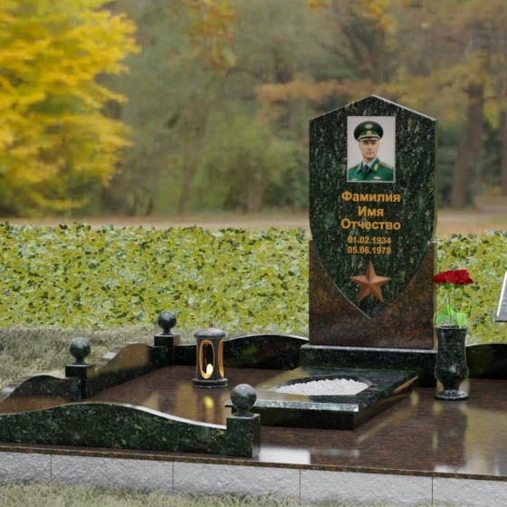 Форма щита в мемориальной архитектуре традиционно олицетворяет защиту, честь и непоколебимую волю. Это надгробие из натурального камня словно оберегает покой усопшего, напоминая о его мужестве и твердости духа. Выбор именно такой формы подчеркивает, что человек при жизни был опорой для своей семьи и преданно служил своему делу. Звезда и строгие формы акцентируют внимание на дисциплине и преданности идеалам.