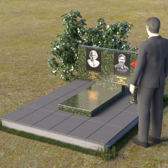 Представленный памятник (артикул ПГ001) являет собой образец строгости и лаконичности, где каждая деталь подчинена общей концепции увековечивания памяти. Композиция состоит из основания, облицованного серыми плитами, горизонтальной плиты, и вертикальной плиты с портретами. Дополнительно предусмотрена тумба для вазы.
