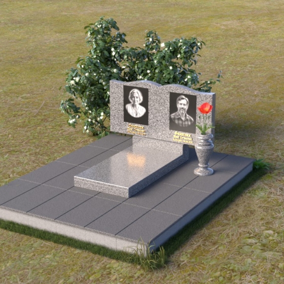 Этот гранитный монумент представляет собой вертикальную композицию, где основной акцент сделан на верхней части. Верхний край памятника имеет сложную, волнообразную форму, напоминающую плавные изгибы морской волны или нежные лепестки цветка. Этот элемент придает монументу легкость и изящество, смягчая строгость камня. Боковые грани монумента обработаны таким образом, чтобы подчеркнуть его вертикальность и стройность. Фаски по краям смягчают переход от лицевой поверхности к боковым, создавая ощущение завершенности и гармонии. Лицевая сторона монумента отполирована до зеркального блеска, отражая небо и окружающий мир, словно запечатлевая в себе вечность. На полированной поверхности выгравированы портреты усопших, выполненные с высокой степенью детализации. Под портретами расположены надписи с именами и датами жизни, выполненные строгим, элегантным шрифтом.