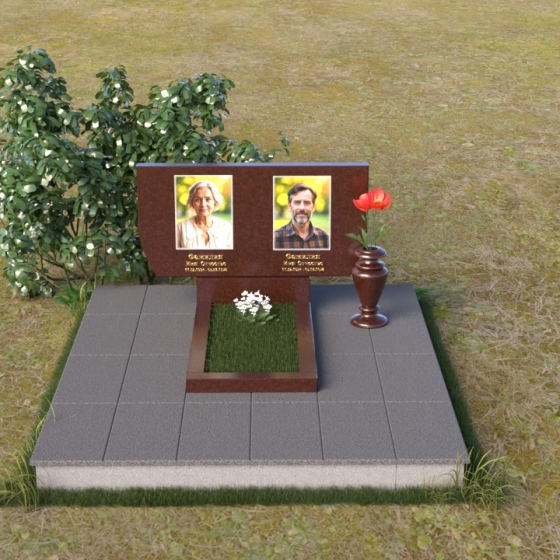 Памятник ПГ015 представляет собой композицию, состоящую из массивной стелы, горизонтальной плиты и тумбы. Стела, выполненная в форме прямоугольника со слегка скошенными верхними углами, создает ощущение надежности и основательности. Зеркальная полировка камня придает ей благородный блеск, отражая свет и создавая игру теней, подчеркивающую глубину и объем. На стеле располагаются два портрета, выполненные с высокой точностью, а также памятные надписи, выполненные золотым шрифтом. Справа от портретов, словно символ вечной памяти, размещена небольшая ваза, в которой можно разместить живые или искусственные цветы.